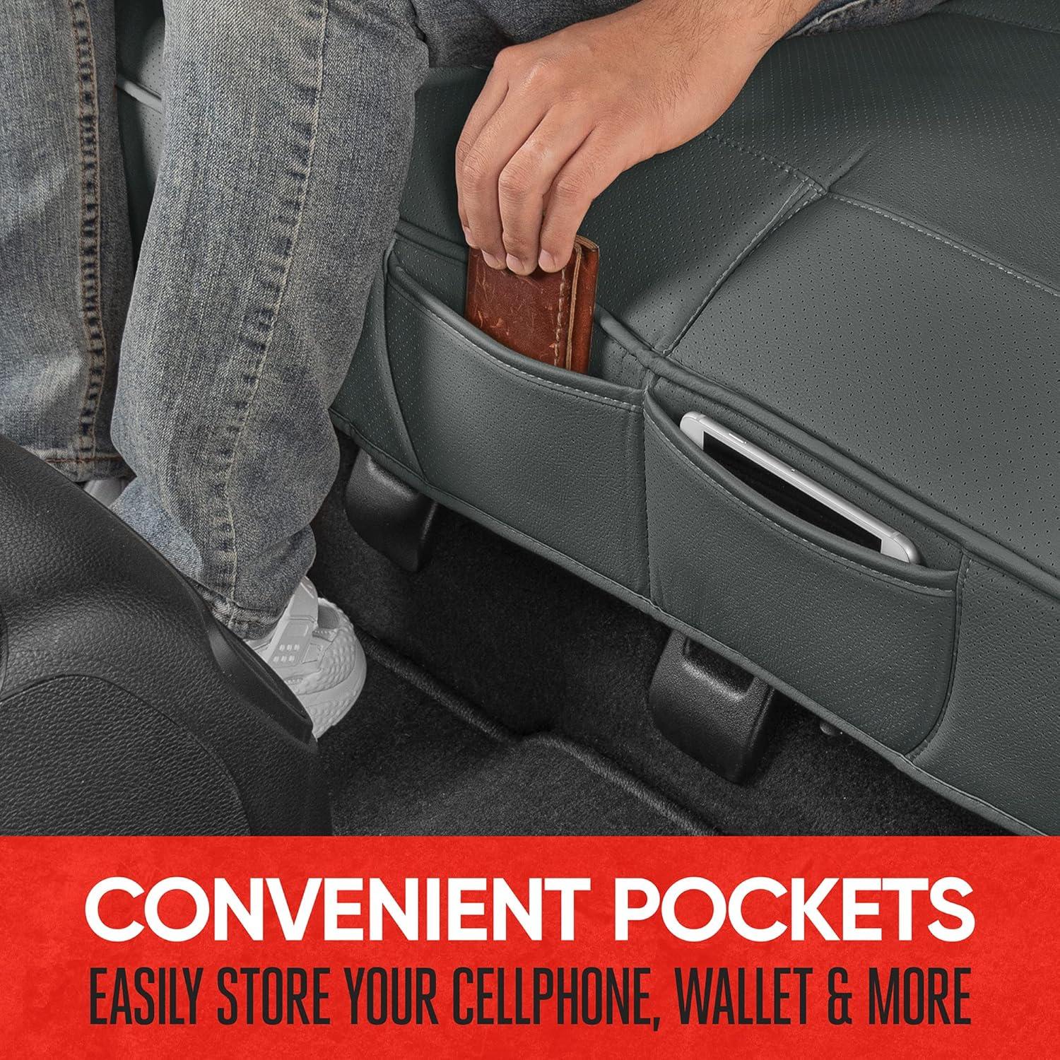 Motor Trend Universal Car Seat Cushion (Bench) – Padded Luxury Cover with Non-Slip Bottom & Storage Pockets – Gray Faux Leather Rear Chair Protector for Auto, Truck & SUV